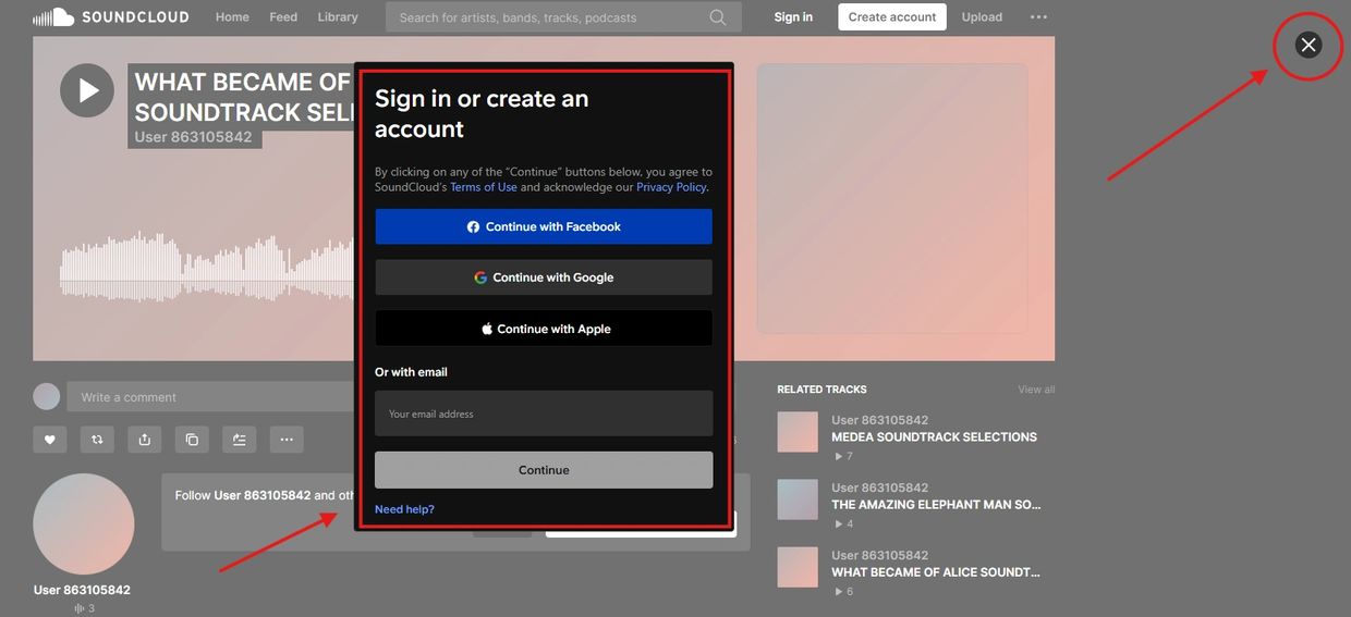 When you make your selection, the SoundCloud streaming platform will open. A sign in window will appear. YOU DO NOT NEED TO SIGN IN. As seen in the diagram above, simply click on the 'X' in the top right corner of your screen to remove the 'sign in' option. Once you remove the 'sign in' option, the music excerpts will play